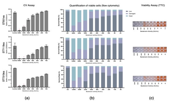 Eradication of Listeria monocytogenes ATCC14313 biofilm by semi-purified bacteriocins ST651ea, ST7119ea, and ST7319ea after 1 h challenge. Biofilms were quantified by (a) crystal violet assay (significant changes in biofilms after challenge were indicated by * at p ≤ 0.05); (b) quantification of live, dead, and damaged cells through flow cytometry; and confirmation of (c) cell viability using TTC.