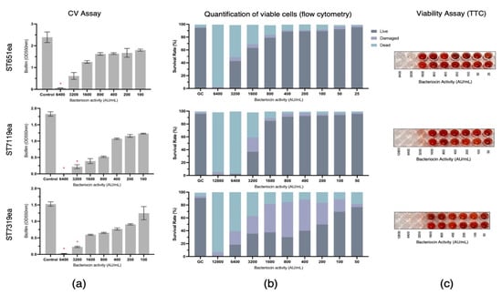 Eradication of Enterococcus faecium VRE19 biofilm by semi-purified bacteriocins ST651ea, ST7119ea, and ST7319ea after 1 h challenge. Biofilms were quantified by (a) crystal violet assay (significant changes in biofilms after challenge were indicated by * at p ≤ 0.05); (b) quantification of live, dead, and damaged cells through flow cytometry; and confirmation of (c) cell viability using TTC.