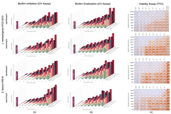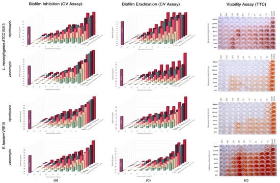 2.2. Determination of Minimum Inhibitory Concentrations (MIC) of Antibiotics against Planktonic Cells of L. monocytogenes ATCC15313 and E. faecium VRE19