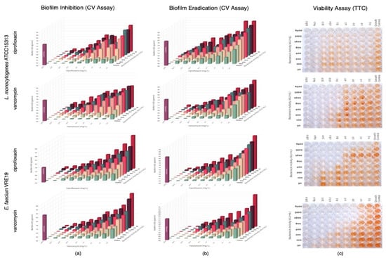 Evaluation of synergy between semi-purified bacteriocin ST7119ea and antibiotics (ciprofloxacin or vancomycin) on the (a) biofilm formation and (b) biofilm eradication of Listeria monocytogenes ATCC15313 and Enterococcus faecium VRE19 as demonstrated on the topographic analysis biofilms by crystal violet assay; and (c) confirmation of cell viability were carried out using TTC assay.