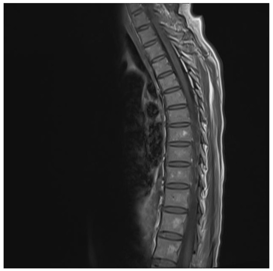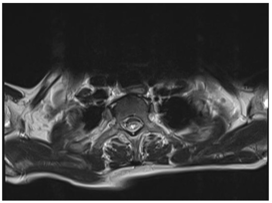 The chest and brain tomography did not display any abnormalities. The spinal MRI performed on the second day of hospital admission showed irregular intramedullary signal enhancement on the T2 sequence with diffuse lesions ranging from the sixth cervical vertebra to the seventh dorsal vertebral (Figure 1). The T1 sequence showed the spinal cord with multiple hypointense lesions centrally located at the cervical–dorsal level (Figure 2), while the transversal image T2-weighted image of the spinal cord showed hyperintense lesions in the white matter and in the posterior portion of the spinal cord (Figure 3).