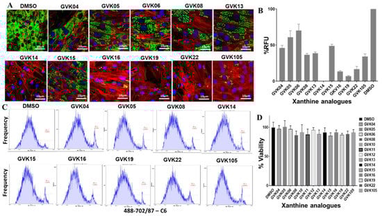 Stable GFP-expressing trypomastigotes (Tulahuen strain) were generated using the myoblasts. Trypomastigotes were collected after the second release, in which higher numbers of the single form of parasites could be found. The inhibitor evaluation experiments were performed in 24-well plates in triplicate at an infection ratio of 10 parasites per cell after 24 h of infection; cells were washed to remove the unbound trypomastigotes, and RHMs were treated with several modified compounds to evaluate the efficacy of the inhibitors. Several molecules, GVK 14, 16, 19, and 22, decreased the growth of amastigotes inside the infected cells compared to solvent control, DMSO (Figure 2A). The green fluorescence intensity was measured and is represented as RFUs in the graph (Figure 2B), where the RFUs are compared to the DMSO control. To further rule out the toxicity of the drugs to the host cells, we performed FACS analysis of the cells that were treated with annexin V staining, along with PI staining, to determine quantitatively the cells undergoing apoptosis. To determine the viability of cells during the inhibitor treatment, PI staining was used. The cells positive for FITC annexin V, negative for PI, or positive for FITC annexin V/positive for PI were undergoing apoptosis or at the end stage of apoptosis, respectively. It was found that the inhibitor-treated cells presented negative staining for both FITC annexin V and PI and were not undergoing apoptosis, indicating that the inhibitors are not toxic to the cells. The xanthine analogs showed no toxicity in the host cells (Figure 2C). The cells were also checked for the cytotoxicity effect of the Xanthine analogs using the CCK-8 assay, where the RHM cells were treated with the highest concentration of the analogs, 100 nM, for 48 h and cell viability remained over 80% after treatment with various xanthine analogs (Figure 2D).