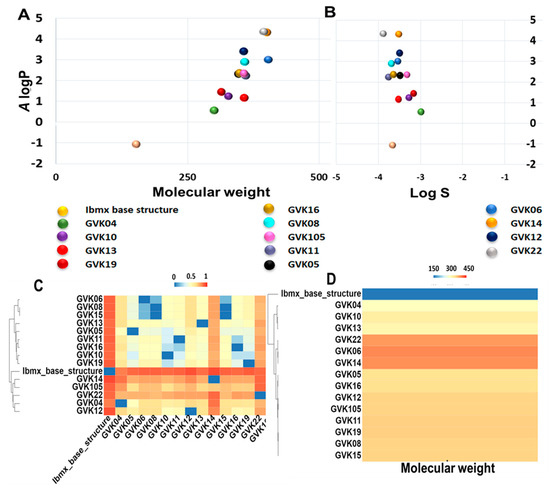 Distribution of chemical properties on xanthine analogs. Panel (A): Chemical space distribution of xanthine analogs. Chemical space is defined by molecular weight (MW) as the X-axis and Ghose–Crippen Log Kow (A log P) as the Y-axis. Panel (B): Ghose–Crippen Log Kow (A log P) (lipophilicity) versus aqueous solubility (log S). Panel (C): The molecular weight distribution of the xanthine analogs used in this study. Compounds with similar molecular weight are closer in color. Panel (D): Tanimoto similarity index for all xanthine analogs used in this study; colors closer to red in the heat map mean that the compounds are more similar, and colors closer to dark blue mean that the compounds have higher diversity.