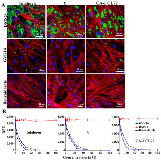 Effect of compounds on actively growing amastigotes in heart myoblasts infected with three T. cruzi strains. (A) RHM infected with GFP-expressing trypomastigote clones of Tulahuen, Y, and CA-1CL72 strains (infection of 10 parasites per cell) after 24 h of infection and then treated with GVK14 (50 nM) or, as positive control, benznidazole (50 nM) or DMSO. Green color represents T. cruzi amastigotes; blue represents cardiomyocyte nuclei; red is myoblast actin myofibrils. (B) Line graph depicting dose-dependent suppression of the Tulahuen, Y, and CA-1 CL72 strains expressed as relative fluorescence units (RFUs) at 72 h are shown. All experiments were performed in triplicate, and the results are presented as means ± SEs. Statistical analysis was performed by two-way ANOVA, p < 0.05.