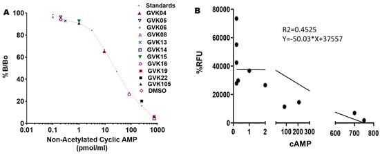 Changes in secreted cyclic AMP (cAMP) levels with the treatment of PDE inhibitors. Panel (A): cAMP levels were measured using the Cayman ELISA kit after treating the Tulahuen strain of T. cruzi. The red-lined graph represents the standards of the cAMP provided by the manufacturer. All experiments were performed in triplicate, and the results are presented as means ± SEs. This is a competition assay, and the levels of secreted cAMP are shown on the X-axis. Statistical analysis was performed by two-way ANOVA, p < 0.05. Panel (B): Represents the correlation graph that shows the treatment of analogs on RHM cells compared with the secreted cAMP levels. Graphs were created based on green fluorescence intensity, which is measured as % RFU intensity; DMSO control is shown as 100%. The 95% CI is −0.8994 to −0.1609, with a Pearson’s r-value of −0.67.