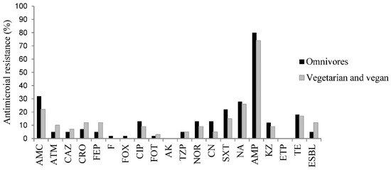 Percentage of antimicrobial resistance profile of E. coli isolated from omnivores and vegetarians/vegans. Amoxicillin-clavulanic acid (AMC), Aztreonam (ATM), Ceftazidime (CAZ), Ceftriaxone (CRO), Cefepime (FEP), Nitrofurantoin (F), Cefoxitin (FOX), Ciprofloxacin (CIP), Cefotaxime (FOT), Amikacin (AK), Piperacilin-tazobactam (TZP), Norfloxacin (NOR), Gentamicin (CN), Trimethoprim-sulfamethoxazole (SXT), Nalidixic acid (NA), Ampicilin (AMP), Cefazolin (KZ), Ertapenem (ETP), Tetracycline (TE) and Extended-spectrum β-Lactamase (ESBL).