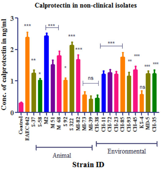 The concentration of calprotectin (ng/mL) in BALB/c mice infected with the EAEC strain of environmental and animal origin. * p, 0.05; ** p, 0.01; *** p, 0.001; comparison by one-way ANOVA with Dunnett’s multiple comparison tests. NS = non-significant.