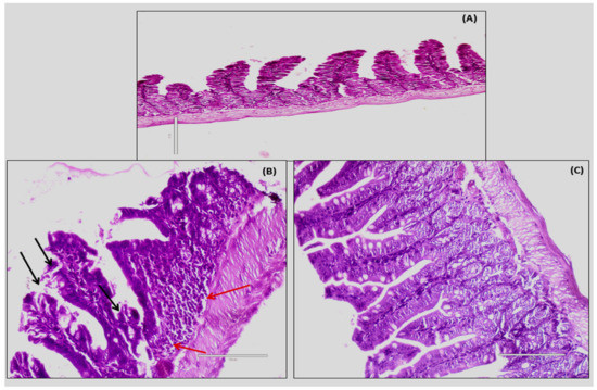 Shows mice intestine treated with PBS as control (A) EAEC strain-infected mice intestinal mucosa on 1st day showing disrupted surface epithelium (black arrows) and inflammatory cells (red arrows) (B) and mice intestine almost coming back to normal on 15th day after the challenge with the EAEC strain (C).