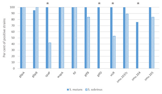 All of the investigated genes play important roles in the physiology of MS. If the genes are turned off, the strain may be less resistant to environmental conditions, as changes may occur in the formation and structure of the biofilm [12,27,28], in adhesion to the tooth surface [29,30,31] or a decrease in EPS production [21,32]. Current research revealed that most of the S. mutans strains carried all the virulence genes studied, both essential and virulence-enhancing, related to biofilm formation, adhesion, acid production and tolerance, and interactions with the environment. In contrast, several virulence genes occurred less frequently in S. sobrinus strains. Previous studies have also shown some differences between these species. For example, de Soet et al. [33] and Igarashi et al. [34] found that S. sobrinus has a higher acid production capacity than S. mutans. In addition, previous research [34,35] has shown that S. sobrinus is rich in GTF-producing genes, and the most important is gtfB. In our study, this gene was found in 82% of the S. sobrinus strains studied, but the gtfD gene was completely absent in our strains. Other genes not studied in this work may compensate for the production of different glycotransferases.