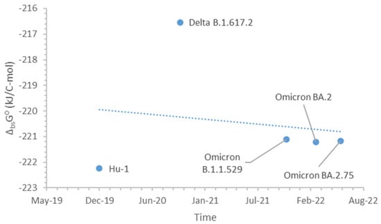 Figure 1 shows the standard Gibbs energies of the biosynthesis of nucleocapsids and their dates of appearance of SARS-CoV-2 variants including Hu-1 (Wild type), Delta B.1.617.2, Omicron B.1.1.529, Omicron BA.2, and Omicron BA.2.75. From the graph, it is possible to see the evolution of SARS-CoV-2 related to the multiplication inside the host cells. The trend of evolution is given by the dotted line. The values for the Omicron B.1.1.529, Omicron BA.2, and Omicron BA.2.75 variants were very similar. This implies that the mutations mostly occurred in the part of the nucleic acid related to the binding domain, rather than multiplication inside the host cell.
