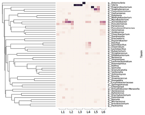 16S rRNA sample heatmap showing diversity of 16S rRNA reads from sentinel washcloths laundered in 6 public laundromats (one washcloth per washing machine, with the laundromats designated as L1–L6).