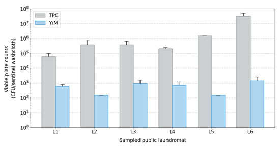 Bar plot of viable plate counts across sampled laundromats (L1–L6). Viable plate counts (bacterial and fungal) from extracted sentinel washcloths (one per washing machine) post-laundering using a cold-water cycle in public washing machines. Abbreviations used: CFU, colony-forming units; TPC, total plate counts; Y/M, yeast and mold counts.
