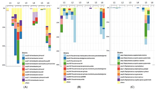 Genus-specific Taxa plots displaying Acinetobacter (A), Pseudomonas (B), or Staphylococcus (C) species diversity. Species diversity of key biofilm-forming nosocomial pathogens identified on sentinel washcloths (one per washing machine) after laundering in public washing machines.