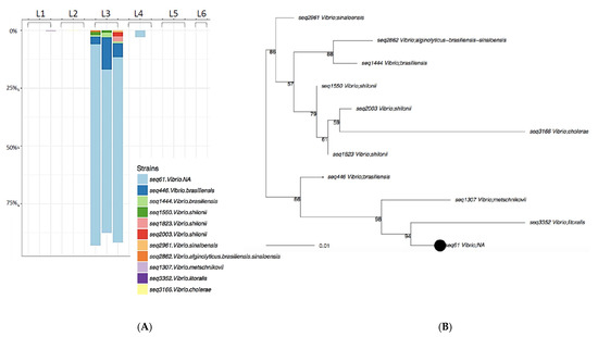 Laundromat L3 rRNA Taxa plot (A) and sequence diversity (B). Vibrio species were identified in high abundance on samples washed in Rockland County, NY (L3).