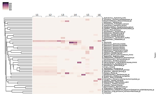 Heat map of fungal identifications from sentinel washcloths (one per washing machine) laundered in public washing machines.