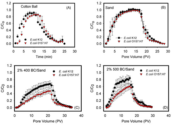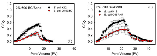 Figure 1 shows the BTCs of the transport of E. coli O157:H7 and E. coli k12 through sand mixed with biochars (400, 500, 600, and 700 °C) at a 2 wt. % ratio. The transport of both bacterial strains in negative controls of cotton balls and 100% sand columns were also quantified. The shapes of the BTCs differed depending on the biochar used and the bacterium examined. For example, Figure 1A,B demonstrated symmetrical BTCs with a reasonably sharp breakthrough front, sharp tailing, and a period of constant steady-state adsorption of bacteria to porous media, as indicated by the plateau between pore volumes 6–12 for cotton balls and 10–20 for sand. Such BTCs indicate that the rates of attachment and detachment of bacteria from the sand or cotton balls are similar. They also indicate that the attachment, if any, is irreversible and strongly bound to porous media. In comparison, Figure 1C–F represented asymmetrical BTCs that are exhibiting a degree of tailing in their front adsorption and desorption portions of data. They were also characterized by a continuous slope in the adsorption data that does not establish a steady state during the time of measurements.