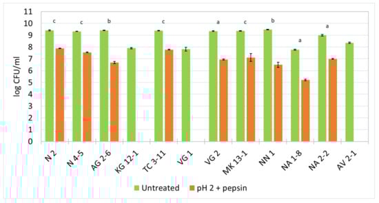 Survival ability of the newly isolated lactic acid bacterial strains in pepsin in pH 2. Means: a—nonsignificant (p > 0.05); b and c—significant (p < 0.05 and p < 0.01, respectively).