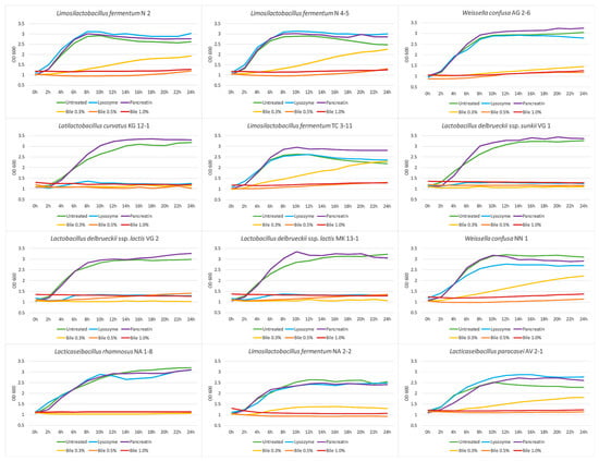 An in vitro growth dynamics analysis was held to evaluate the stability of the newly isolated LAB strains in the presence of the different stress factors in the GIT [39] with some modifications. The analysis was performed with a SPECTROstar® Nano Microplate Reader in a 24-well flat bottom plate. LAB cultures for 24 h were inoculated in wells with MRS broth as a positive control and with MRS broth with different stress factors added: lysozyme 150 mg/L (Fluka, Sygma-Aldrich, Steinheim, Germany) with 78,643 U/mg activity; pancreatin 0.1% (HiMedia, India) and pH brought to pH 7; ox-bile 0.3%, 0.5%, and 1.0% (Sigma-Aldrich, USA). Blank wells with uninoculated MRS broth were used as a negative control. The prepared plate was then incubated in the microplate reader at 37 °C for 24 h and measurements were set to be automatically taken every two hours by the OD at 600 nm.
