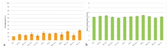 The autoaggregative potential of the tested LAB strains was assessed and presented in Figure 4a. The results show that all the tested strains can autoaggregate and exhibited these properties in the range of 10.3–26.6% for 4 h of incubation. The highest autoaggregation was reported for the trains L. delbrueckii subsp. sunkii VG 1, L. rhamnosus NA 1-8 and L. paracasei AV 2-1. All other LAB strains exhibited below 20% autoaggregative properties. It is important to note that the conditions of the experiment, such as the culture age, time, and temperature, have a significance for the determination of the autoaggregation ability.