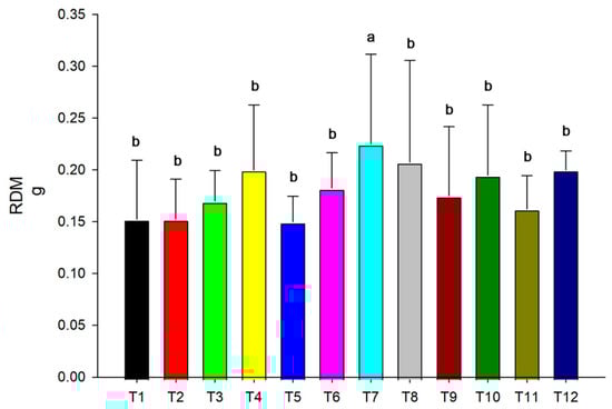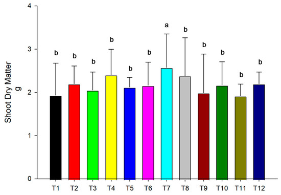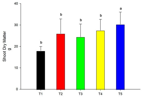 Among the treatments applied under field conditions, the mixture of A. brasilense + T. harzianum (T5) obtained the highest average shoot dry matter (30.34 g) (p < 0.05), which was 60.0% higher than that found in the control group (18.03 g). The other treatments did not differ from each other (Figure 3).