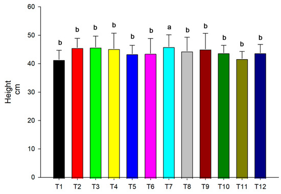 Treatment 7 (A. brasilense + B. japonicum) had the highest average height among the treatments (46 cm) (p < 0.05); this value was 9.78% higher than that found in the plants of the control group (41.5 cm). There was no significant difference regarding the height of the peanut plants in other treatments (Figure 4).