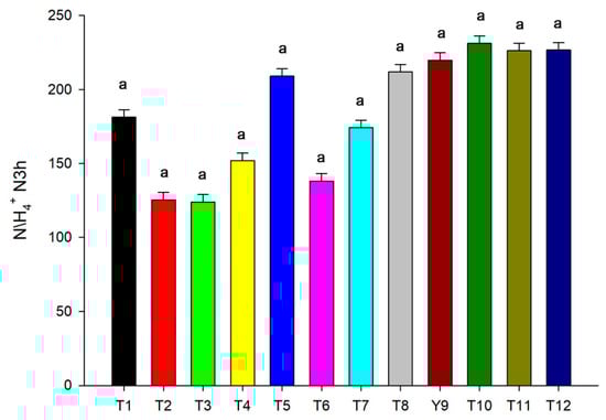 The values of urease activity varied from 124,043 µg NH4+/gram of dry soil to 231.175 µg NH4+/gram of dry soil, and there was no difference among the treatments (p > 0.05) (Figure 6).