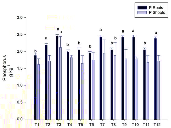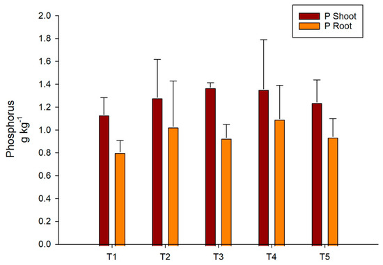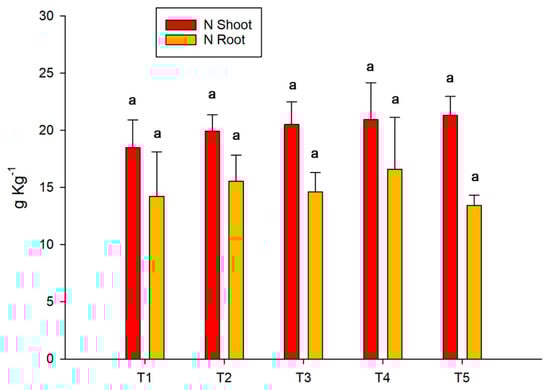 Under greenhouse conditions, the nitrogen content from roots varied from 18.96 g kg−1 to 23.63 g of nitrogen kg−1 root. There was no significant difference among the treatments (p > 0.05) (Figure 7). Regarding the nitrogen concentration in the shoots of the plants, B. subtilis (T3) was the inoculant that promoted the highest concentration among the other treatments, with 31.15 g of nitrogen kg−1 in the shoot, a value 15.46% higher than that found by the control group (26.33 g kg−1). The other treatments did not differ from each other (Figure 7).