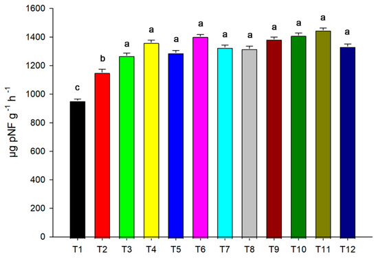In all treatments that received inoculants, the activity of the acid phosphatase enzyme was significantly higher than that of the control group. The result in Bradyrhizobium japonicum + Trichoderma harzianum, for example, 1,449,365 µg pNF g−1 h−1, was 33.93% higher than that found in the control group (957,586 µg pNF g−1 h−1). Interestingly, the treatment with A. brasilense (T2) was higher than the control but lower than the other treatments (Figure 9).
