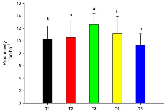 B. japonicum was the only treatment that promoted the highest yield (12,623 kg ha−1), a value 18.52% higher than that found for the control group (10,285 kg ha−1). The other treatments did not differ from each other (Figure 12).