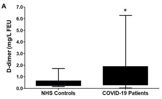 - Yu, B.; Li, X.; Chen, J.; Ouyang, M.; Zhang, H.; Zhao, X.; Tang, L.; Luo, Q.; Xu, M.; Yang, L.; et al. Evaluation of variation in D-dimer levels among COVID-19 and bacterial pneumonia: A retrospective analysis. J. Thromb. Thrombolysis 2020, 50, 548–557. [Google Scholar] [CrossRef] [PubMed]