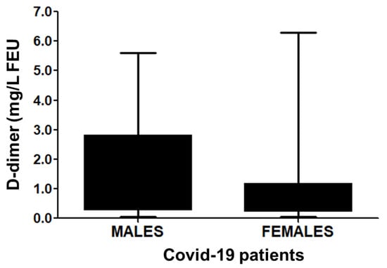 D-dimer levels in male and female COVID-19 patients. Of the COVID-19 patients, levels of D-dimer in the blood samples of males (n = 97) and females (n = 51) were measured. Male COVID-19 patients vs. female COVID-19 patients, p = 0.4488 (95% CI -0.4277 to 0.9575). Box and Whisker show the Min to Max values with median ± SD.