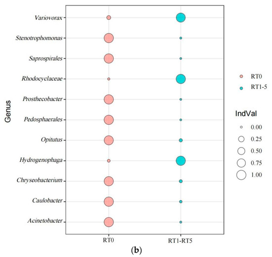 Key players involved in phenanthrene degradation. RT0, phenanthrene-consuming enrichment culture. RT1–RT5, phenanthrene-consuming subcultures. (a) Dynamics of phenanthrene-consuming bacterial communities derived from Antarctic soil. The relative abundance of the top 10 most abundant genera is presented. (b), Differentiation of key taxa enriched from phenanthrene-consuming subcultures derived from Antarctic soil. Differentiated genera of the phenanthrene-spiked communities by cross-validation analysis. The Y-axis denotes the differentiated taxa of the phenanthrene-spiked communities. The X-axis denotes different treatments. The circle size denotes the indicator value of the corresponding microbial taxa.