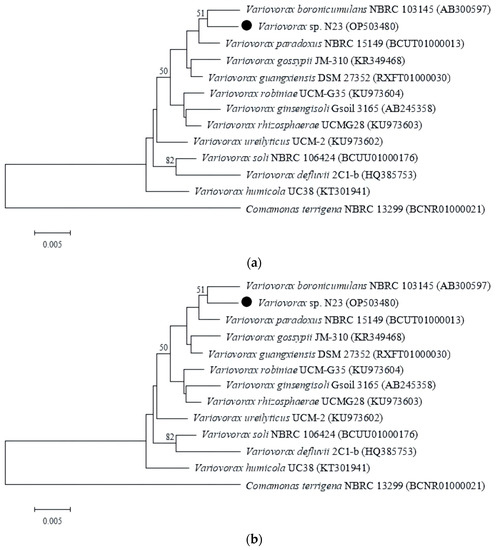 Based on the 16S rRNA gene sequence analysis, strain N23 exhibited the highest similarity (99.12%) to the type of strain Variovorax boronicumulans NBRC 103145T [11]. Moreover, a phylogenetic tree based on the multiple sequence alignment of the 16S rRNA gene sequences also revealed that strain N23 belongs to the genus Variovorax and formed a monophyletic clade with the closet type strain V. boronicumulans NBRC 103145T (Figure 2a). Similarly, strain N23 formed an independent branch distinct from other reference species of the genus Variovorax in the phylogenomic tree (Figure 2b).