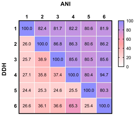 Heatmap of DDH and ANI percentages between strain N23 and its closely related type strains of genus Variovorax. Strain 1, Variovorax sp. strain N23; 2, V. boronicumulans NBRC 103145T; 3, V. guangxiensis DSM 27352T; 4, V. paradoxus NBRC 15149T; 5, V. soli NBRC 106424T; 6, V. beijingensis 502T.