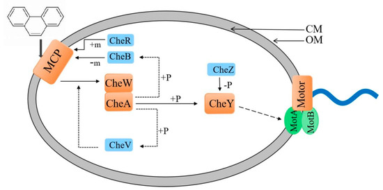 Chemotaxis and motility of Variovorax sp. strain N23. The chemotaxis and motility genes are predicted by the KEGG database. +m—methylation; −m—demethylation; +P—phosphorylation; −P—dephosphorylation; OM—outer membrane; CM—cytoplasm (inner membrane). The solid and long dotted arrows represent one-step and multistep reactions, respectively. The short, dotted arrows represent feedback regulation.