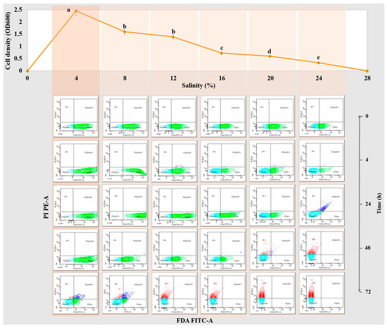 For both strains, the maximal growth was recorded at 24 h of incubation. Figure 1 and Figure 2 report the growth profiles of strains S28 and S19, respectively, in liquid cultures at different salinity conditions (0–28% NaCl concentration, steps of 4%); for each salinity level, the correspondent output of the FC analyses (PI/FDA staining) at different growth times (0, 4, 24, 48 and 72 h) is also shown.