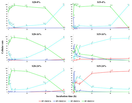 To obtain further insights into the differences in the physiological responses between the two strains, a different combination of fluorogenic staining (DiOC6/PI) was used. Figure 3 shows the comparison of the time evolution of the two strain cell subpopulations at the salinity related to maximal and/or optimal growth (8% NaCl for S28 and 4% NaCl for S19), intermediate salinity (16% NaCl), and at the upper range limit (24% NaCl).