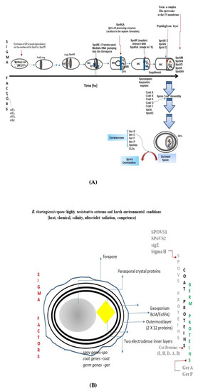 Sporulation in the phylum Firmicutes plays a fundamental role as a cytological and morphological process during life cycle. Genes and proteins constitute players in spore formation and germination [10,17,19,20,21,22,23,24]. Currently, the high-throughput technologies, integrated as the omic technologies, should allow for deep insight into the unveiling of the complex machinery of the sporulation and germination of spore-forming bacteria [25,26].