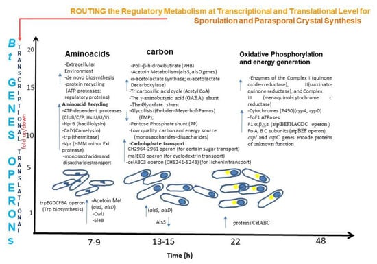 A myriad of genes is associated with the different biological processes in bacteria. Sporulation and crystal synthesis require routing the regulatory metabolism (amino acid biosynthesis, amino acid transport, carbon supply, carbohydrate transport, and energy generation) at transcriptional (fold-up/down) and translational levels (amount of protein). How the different nutrient sources are routed and regulated for cell growth requires high expression levels of genes. At 7 to 8 h, many genes encoding proteases are induced, and they have functions such as transport and carbohydrate conversion for energy supply. While at 13 and 22 h, some other proteins start to increase and decrease other proteins required for the subsequent step in sporulation and crystal formation. The routing of the regulatory metabolism is quite complex. It is an up and down fold regulation as well as an increase-decrease production of proteins that successfully each cell growth accomplish this task efficiently. It seems that B. thuringiensis has evolved strategies to save energy and to profit from external nutrient sources [35,36].