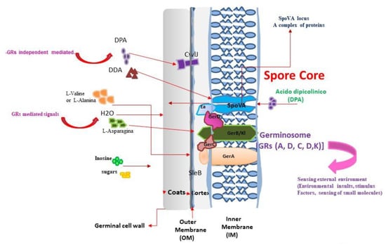 In spore germination, molecular and morphogenetic changes are carried out as crosstalk among signals, germinant nutrients, and spore components in the committed endospore in order to awaken or break dormancy [190]. For an endospore, the fate and the decision to germinate encodes in the dormant spore. The program of spore germination refers to the multistep mechanism through which spores return to life, an awakening process that enables them to reenter into metabolic activity [190,191,192,193,194]. The knowledge of the components and signals in spore germination derives from studies of the model organism Bacillus subtilis [11,111,195,196]. However, there are current efforts to update and focus on other members of the genus Bacillus, especially those that constitute a problem in pathogenesis, health, agriculture, and in the food industry as well [39,194,197].