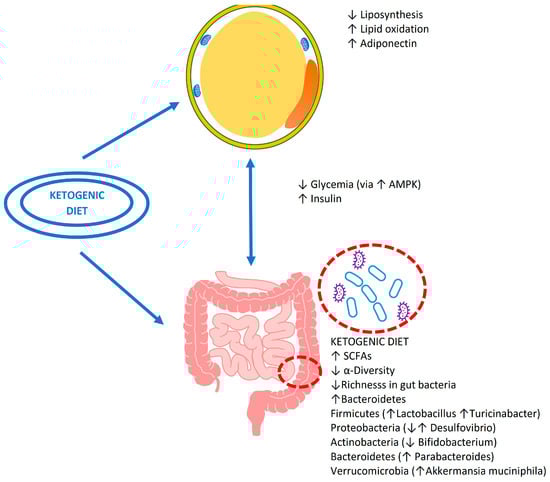 Effects of the ketogenic diet on the intestinal microbiota and main systemic implications (see text). (↑ Increased, ↓ Decreased).