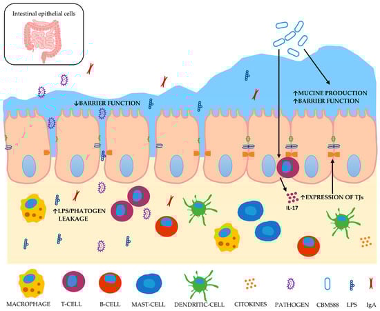 Clostridium butyricum CBM588 promotes the thickness of the mucous layer and the integrity of the tight junctions thanks to the stimulation of the release of IL-17 exerted on the intraepithelial T cells, with a reduced permeability of pathogens and lipopolysaccharide. (↑ Increased, ↓ Decreased).