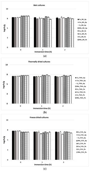 Fruit pieces are known to be suitable immobilization carriers for kefir culture [44,46] and, as expected, total counts of wet immobilized kefir culture on apple and pear pieces exceeded 8 logcfu/g. Application of drying processes (thermal or freeze-drying), however, resulted in significantly (p < 0.05) reduced counts compared to the wet culture [2,3], but still >7.5 logcfu/g in all cases (data not shown). Reduced cell viability after a drying treatment is not uncommon [47,48,49], but cell immobilization is considered to be a promising strategy for the maintenance or even enhancement of kefir culture viability during processing and storage [2,3].