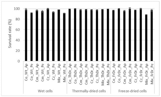 Survival rate (%) of wet, thermally dried and freeze-dried immobilized kefir cultures in low-alcohol wine products supplemented with essential oils (EOs) after 2 h of immersion. Co: low-alcohol wines without EOs addition, Cm: low-alcohol wines with 0.01% v/v Citrus medica EO, Cz: low-alcohol wines with 0.01% v/v Cinnamon zeylanicum EO, Mix: low-alcohol wines with Citrus medica and Cinnamon zeylanicum EOs (0.005% each). The immobilization support is shown at the end of the sample codes. Ap: immobilized kefir cultures on apple pieces, Pe: immobilized kefir cultures on pear pieces.