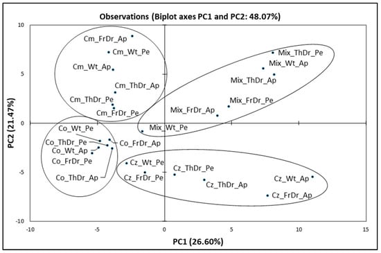 Score plot of the principal component analysis (PCA) of total identified minor volatiles in low-alcohol wine variants with essential oils (EOs) and immobilized kefir cultures. Co: low-alcohol wines without EOs addition, Cm: low-alcohol wines with 0.01% v/v Citrus medica EO, Cz: low-alcohol wines with 0.01% v/v Cinnamon zeylanicum EO, Mix: low-alcohol wines with Citrus medica and Cinnamon zeylanicum EOs (0.005% v/v each). The state of the cells is shown in the middle of the sample codes (Wt: wet immobilized kefir cultures, ThDr: thermally dried immobilized kefir cultures, FrDr: freeze-dried immobilized kefir cultures). The immobilization support is shown at the end of the sample codes (Ap: immobilized kefir cultures on apple pieces, Pe: immobilized kefir cultures on pear pieces).