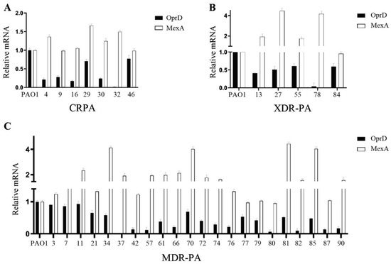 Figure 1. Expression of OprD and MexA mRNA increased in clinically isolated P. aeruginosa. (A) Carbapenem drug resistance group. (B) Extensively drug-resistant group. (C) Multi-drug resistance group. MexA were considered overexpressed when their transcriptional levels were at least two times higher than PAO1 levels, and OprD expression was decreased when their transcriptional levels were equal to or less than 30% PAO1 levels.