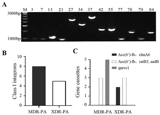 Figure 2. Resistance genes carried by Class I integrons. (A) Identification of gene cassettes by PCR. (B) Number of Class I integrons in MDPA and XDPA strains. (C) Gene cassettes carried by Class I integrons in MDPA and XDPA strains.