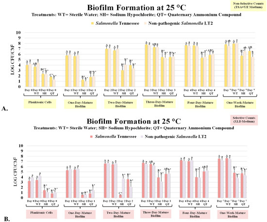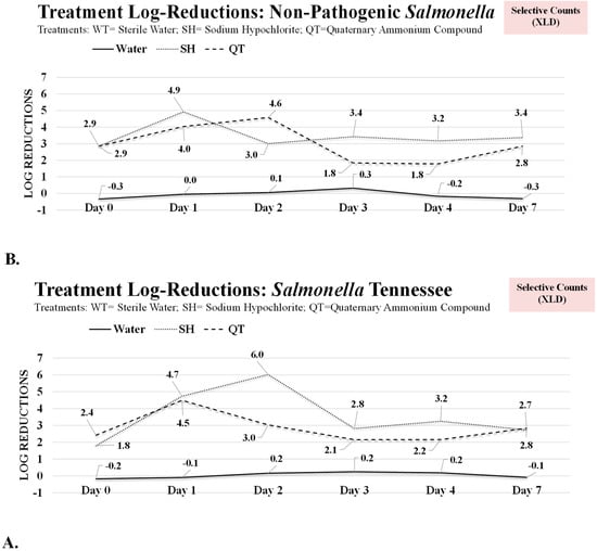 The Tennessee serovar of nontyphoidal Salmonella enterica was chosen in this study due to the historical and regulatory significance of the strain to the stakeholders. Additionally, as discussed earlier, Salmonella enterica serovar Tennessee (Salmonella Tennessee) was the causative agent of one of the most influential foodborne outbreaks associated with food commerce [15,35]. This serovar has exhibited great capability to survive for an extended amount of time even in low-moisture environments, and limited information is available in the literature about the biofilm formation of this epidemiologically important strain. In addition to Salmonella Tennessee, our study utilized Salmonella enterica subspecies enterica serovar Typhimurium, strain designation LT2 (Salmonella LT2). This strain has the ecological and physiological characteristics of pathogenic nontyphoidal Salmonella. In the literature, Salmonella LT2 has been proposed as a potential avirulent surrogate for pathogenic Salmonella [19,20,36,37]. As further detailed in the Methods section, this study evaluated the effects of two common commercial antimicrobial treatments with treated (deionized water) and untreated controls. Sodium hypochlorite and quaternary ammonium compounds are important antimicrobials of choice in healthcare facilities, food and pharmaceutical industries, schools, and nursing homes, as well as domestic environments, and in this study, they were tested at the highest concentration permitted by the regulatory agencies as illustrated on product labels. As detailed in the Methods section, the statistical analyses were conducted for pair-wise comparison of all treatments and controls from various days of the treatments and additionally to compare each treatment and the treated control (DI water treated samples) directly with the untreated control. The former statistical analyses were conducted using a Tukey-based ANOVA and are listed in figures using various uppercase letters, with the letter “A” assigned to the largest value. The later comparisons were achieved using a Dunnett’s-adjusted ANOVA, and in the graphs, these analyses were presented using the “*” sign to indicate a statistical difference (p < 0.05) from the untreated control (Figure 1 and Figure 2). These analyses were conducted on data collected from the selective medium for Salmonella serovars (e.g., XLD agar) and non-selective medium supplemented with yeast extract to ensure maximum recovery of injured cells [33,38]. In addition to these, the pathogen log reductions were presented for selective and non-selective media to afford the opportunity for side-by-side comparisons of the three treatments with the untreated control (Figure 3A,B).