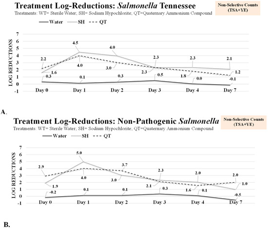 The attachment time to biotic and abiotic surfaces could impact the proliferation and susceptibility of bacterial pathogens to environmental stressors such as antimicrobials [39,40]. In our study, the count from the non-selective medium associated with pathogenic Salmonella Tennessee on day 0 (planktonic cells) was 4.01 ± 0.4 log CFU/cm2 (mean ± SE), and the count remained unchanged (p ≥ 0.05) after treatment with deionized water (WT) and was 3.69 ± 0.3 log CFU/cm2 (Figure 1A). The log reductions associated with WT, SH, and QT treatments for planktonic pathogenic Salmonella cells were 0.3, 1.6, and 2.2 log CFU/cm2, respectively, on the non-selective medium (Figure 2A). These results indicate that treatment with SH and QT could eliminate (p < 0.05) up to >99% of the bacterial pathogen (Figure 1A), and the survivors of the treatments could be less than ≤2.5 CFU/cm2, e.g., ≤320 pathogenic cells (e.g., colony forming unit (CFU)) per cm2. This efficacy of the treatment against planktonic cells of the pathogen is in agreement with the existing literature, where cells of foodborne bacterial pathogens were reduced to nearly the detection limit when the antimicrobial tested against planktonic cells [32]. Additionally, our results show that counts of the non-pathogenic Salmonella LT2 strain were similar to those obtained from the pathogenic serovar (Figure 1A,B, Figure 2B and Figure 3B). The non-selective counts of Salmonella LT2 strain on day 0 were 4.26 ± 0.4, 4.43 ± 0.3, 2.35 ± 0.3, and 1.34 ± 0.4 log CFU/cm2 for the untreated control and WT, SH, and QT treatments, respectively (Figure 1A). These similarities between the pathogenic and non-pathogenic counts indicate that Salmonella LT2 could be used as a surrogate for pathogenic Salmonella in public health microbiology validation studies when utilization of pathogenic serovars is not economically feasible or not possible due to safety reasons.