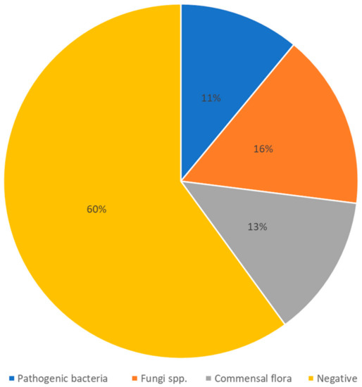 Similar results have been reported by a more recent study regarding superinfections in patients with COVID-19 admitted to the ICU; however, with a much smaller sample size [63]. Another recent retrospective study was done in Western Romania with a larger sample size that included 407 eligible patients that were hospitalized for COVID-19. The study reported a total of 46 samples positive for pathogenic bacteria in their sputum cultures, while 67 patients had positive sputum cultures for commensal bacteria associated with respiratory tissue. Additionally, 51 sputum cultures were positive for fungi. The remaining sputum cultures showed no signs of infection. Figure 2 adapted and summarized these findings [64].